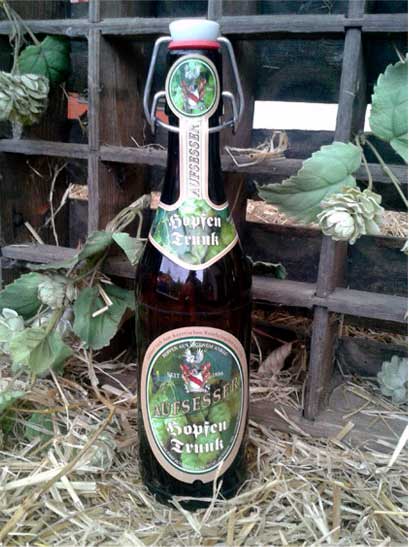 Hopfen Trunk – hopfig ausgeprägt im Geschmack riecht es nach frischem Hopfen. Zur Hopfenernte Ende August brauen wir speziell einen Sud Hopfen Trunk ein. Der Hopfen wird frisch gepflückt und am Tag der Ernte in den Sud gegeben. Dieses Hopfenaroma schmeckt man stark im Nachtrunk. Hopfentrunk ist erhältlich in der Bügelverschlussflasche.